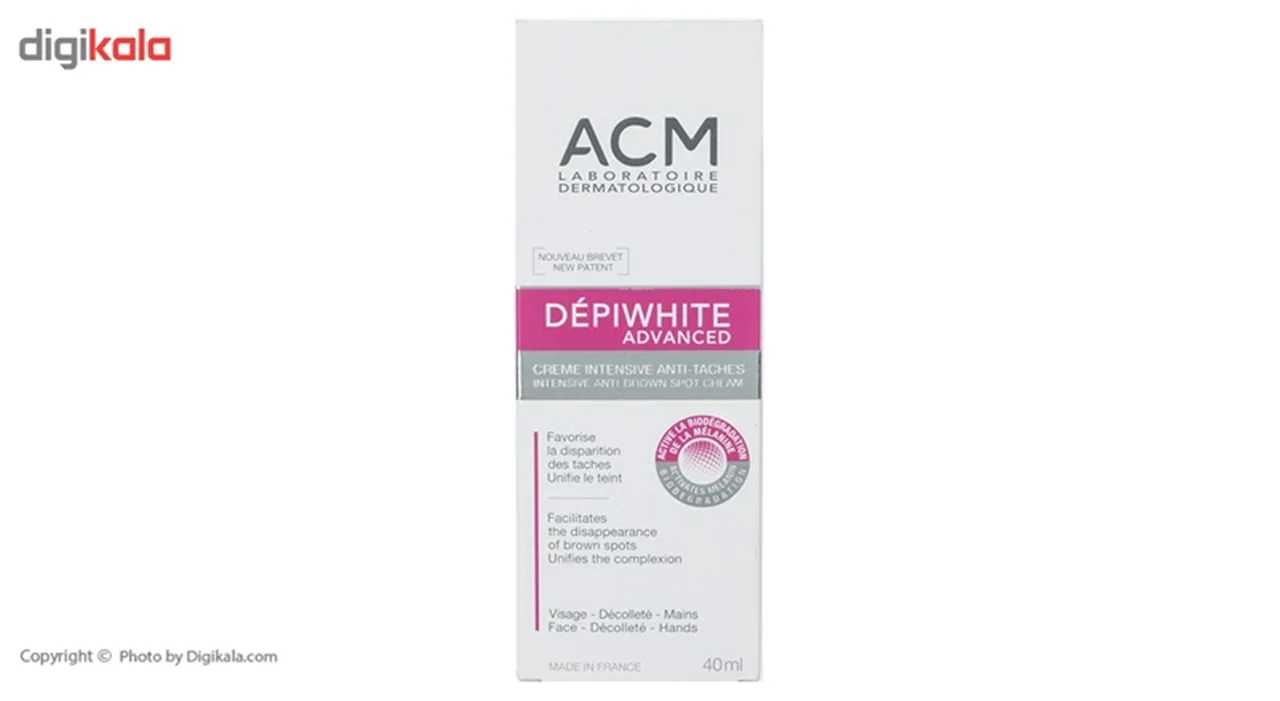 کرم ضد لک ACM دپی وایت Acm Depiwhite Advanced کرم ضد لک دپی وایت ای سی ام یک محصول فوقالعاده با اثربخشی سریع و موثر برای درمان لک و تیرگی روی پوست است. این محصول برای از بین بردن تیرگیهایی که در اثر نور خورشید، افزایش سن، آفتاب سوختگی، زایمان و … کاربرد دارد. کرم ضد لک دپی وایت ای سی ام حاوی ترکیبات موثری همچون ویتامین سی و Antipollon بوده که اثربخشی کرم را افزایش میدهند. به همین دلیل نیز در هفتههای اول استفاده از کرم شاهد از بین رفتن تیرگیهای روی پوست خود خواهید. این کرم به دلیل وجود ویتامین سی خاصیت آنتی اکسیدانی و لایه برداری ملایم دارد و پوست را شفاف میکند.